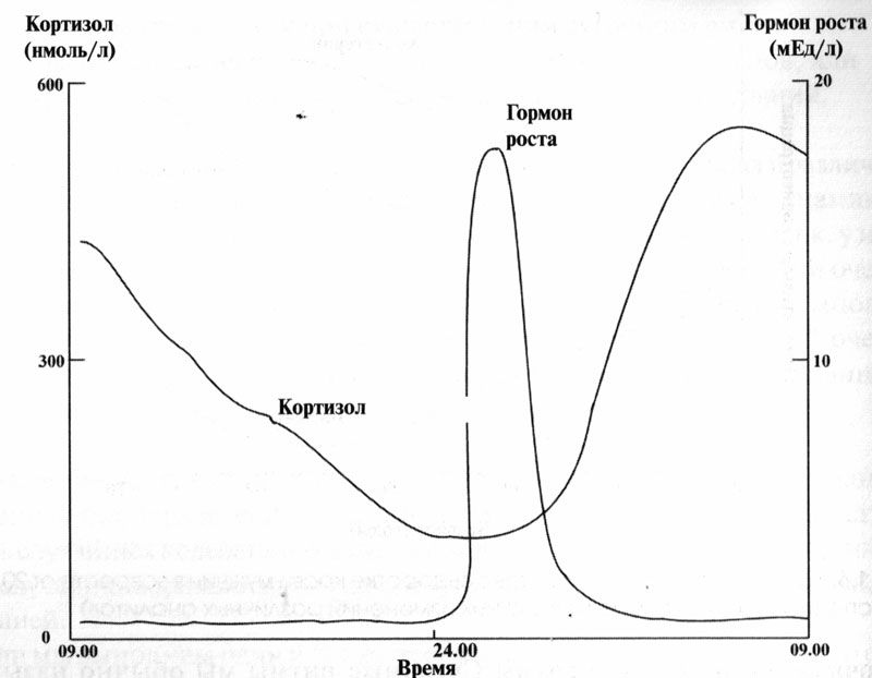 На самом деле для врачей не секрет, что один и тот же показатель может значительно варьироваться даже у одного и того же здорового пациента. (на рис. типичная зависимость кортизола и гормона роста от времени суток).