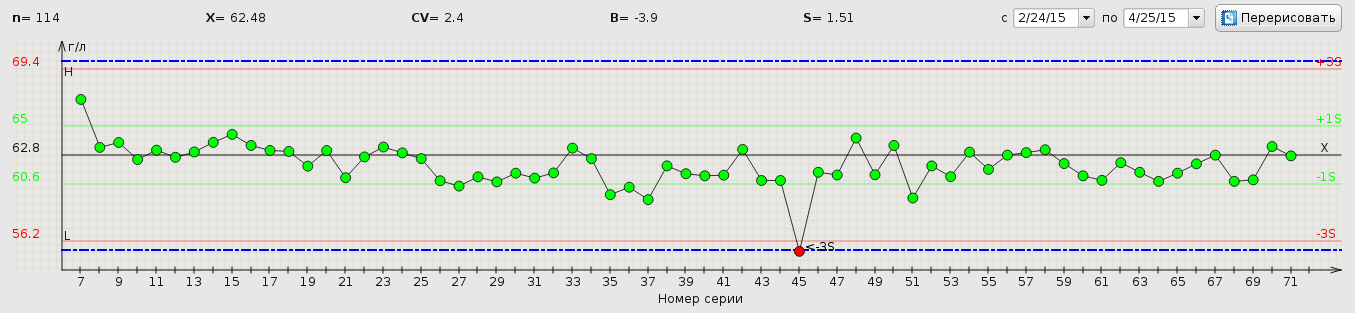 Суть контроля качества лабораторных исследований состоит в периодическом проведении исследований на стандартных (контрольных) образцах, значения аналитов в которых с высокой точностью определены производителем этих материалов. В идеальном мире ежедневно мы бы получали одно и то же паспортное значение, однако в реальном мире на результат накладывает отпечаток множество событий: качество прибора и реагентов, его техническое обслуживание, калибровки, руки лаборанта и пр. Поэтому всегда получается некоторое отклонение от идеального результата.