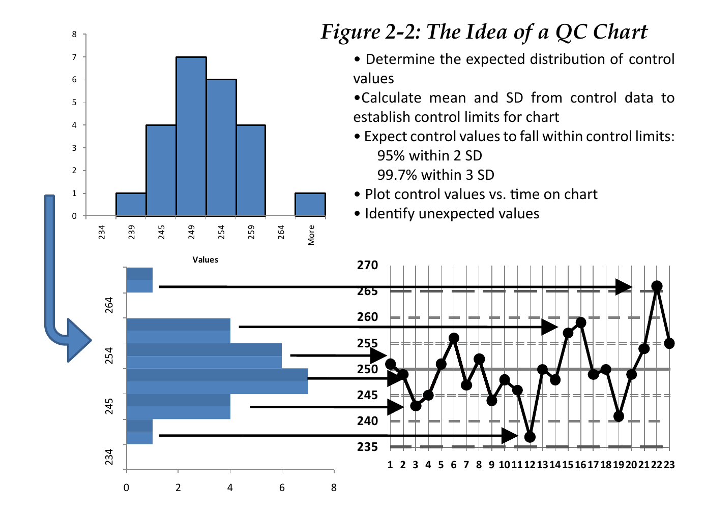 Идея проста – охарактеризовать изменение, которое ожидается при анализе стабильного контрольного материала, затем проверка – соответствуют ли полученные результаты ожидаемому диапазону изменения. Таким образом появляется возможность проверить, находится ли сегодняшний результат в пределах ожидаемого диапазона при использовании SQC, как установленного нормального или референсного диапазона для контроля измерений контрольного материала. Это аналогично использованию нормальных и референсных значений для оценки результатов тестирования пациента и выявления ненормальных условий, требующих внимания.