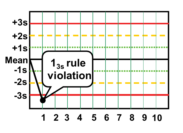13s относится к правилу контроля, обычно используемому с диаграммой Леви-Дженнингса, когда значения контроля формируют лимиты + 3s и -3s. Результат отклоняется, когда измерение одного контроля превышает + 3s или -3s.