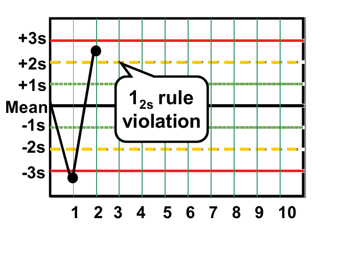 12s Означает, что обычно используется правило контроля c графиком Леви-Дженнингса, когда контрольные пределы установлены как значения ± 2s. В оригинале многофункциональный контроль качества процедуры («Правила Вестгарда») – это правило, используемое в качестве предупреждения и тщательного изучения данных контроля, с учетом других правил отклонения.