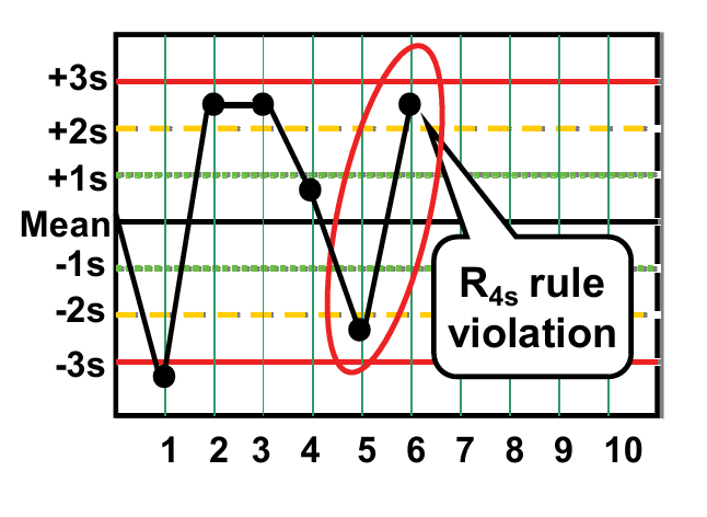 R4s относится к правилу управления, в котором отбраковка происходит, когда 1 контрольное измерение превышает среднюю + 2s, а другое выходит за пределы -2s. Данную ситуацию отображает на графике наблюдение за точками 5 и 6.